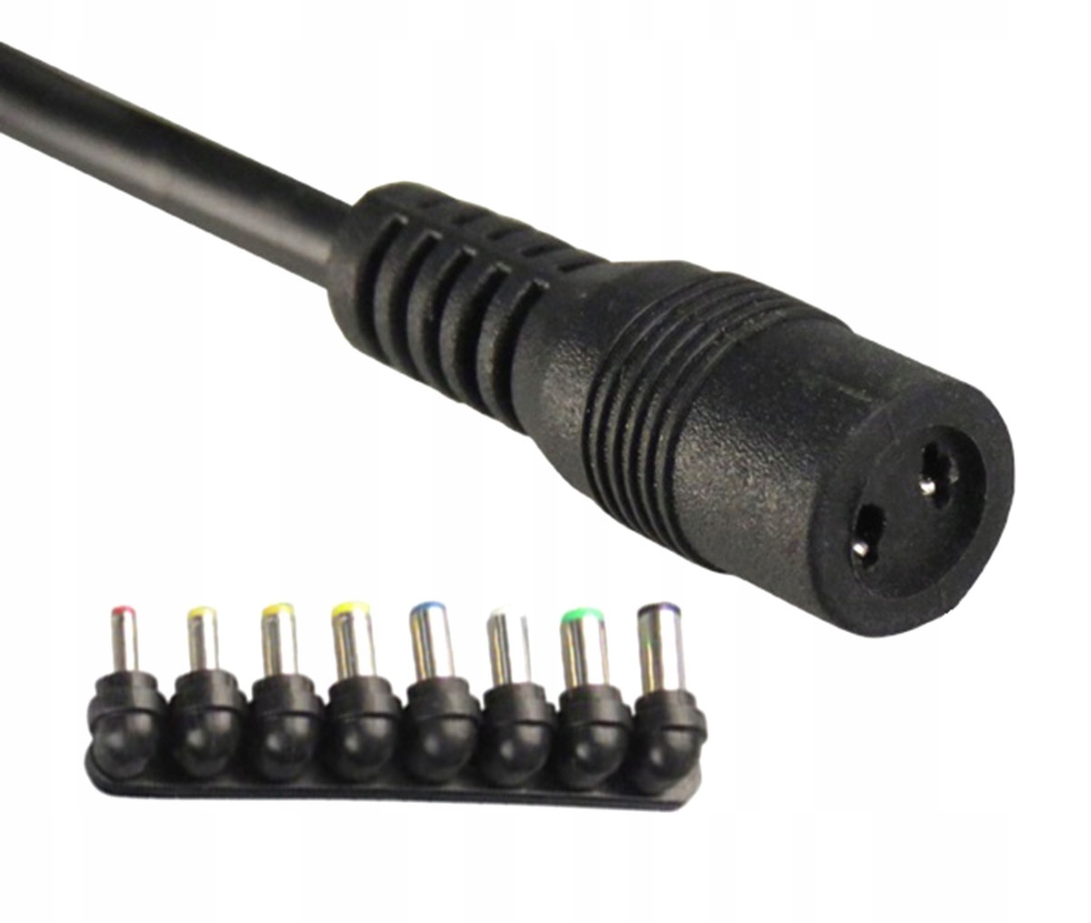 Sieciowy zasilacz uniwersalny do laptopów. Dzięki kompletowi 8 wymiennych wtyków i możliwości regulacji napięcia wyjściowego pozwala dostosować zasilacz do konkretnego modelu laptopa.