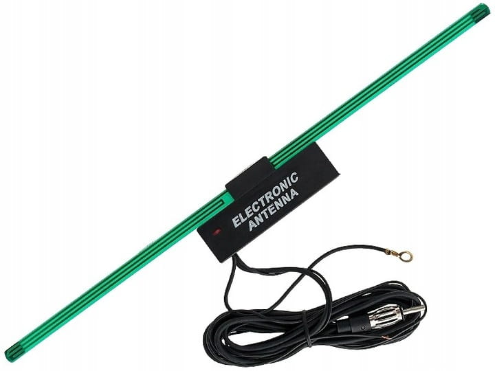 Antena wewnętrzna ze wzmacniaczem montowana wewnątrz pojazdu. Przeznaczona do samodzielnego montażu za pomocą dwustronnej taśmy klejącej mocowanej do przedniej szyby auta.