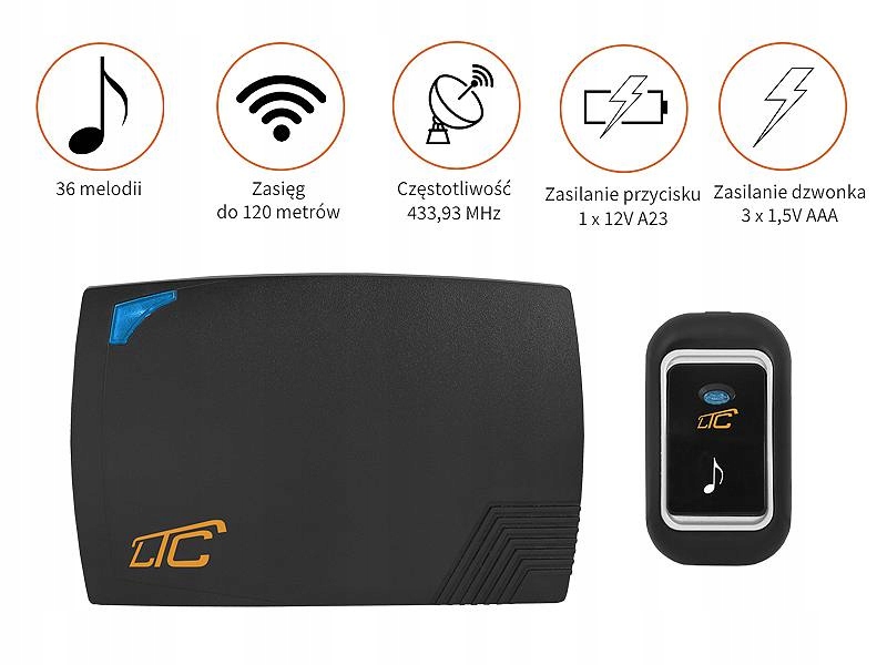 Urządzenie dzwonkowe z przyciskiem komunikuje się za pomocą transmisji radiowej o częstotliwości 433.93 MHz co gwarantuje zasięg do 120 metrów w idealnych warunkach terenowych. Możliwość wyboru spośród 36 melodii pozwala na spersonalizowanie dzwonka według upodobań użytkownika.