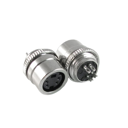 Gniazdo miniDIN/SVHS 4-pinowe do obudowy, okrągłe - złącze żeńskie mini DIN (inna nazwa to złącze S-Video) to zminiaturyzowana wersja złącza DIN - wielopinowego złącza znajdującego zastosowanie w elektronice jako element sprzętu audio, video oraz w informatyce.