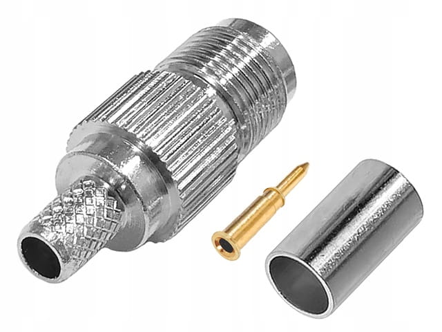 Tulejka na ekranie kabla jest zaciskana, żyła centralna kabla łączona jest z pinem wtyku przez lutowanie lub zaciśnięcie.
