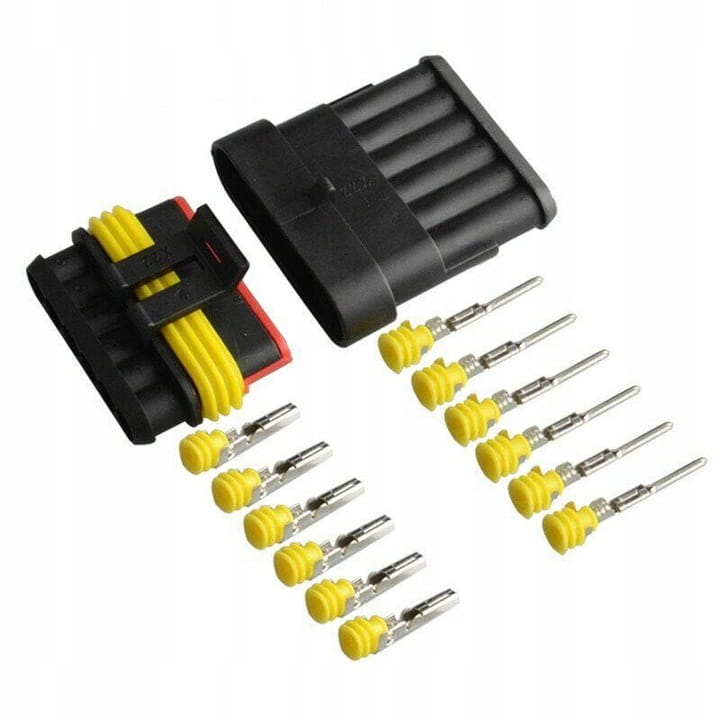 Złącze stosowane w motoryzacji w bardzo szerokim zakresie. W zestawie kostka męska i żeńska, komplet konektorów i uszczelnień.