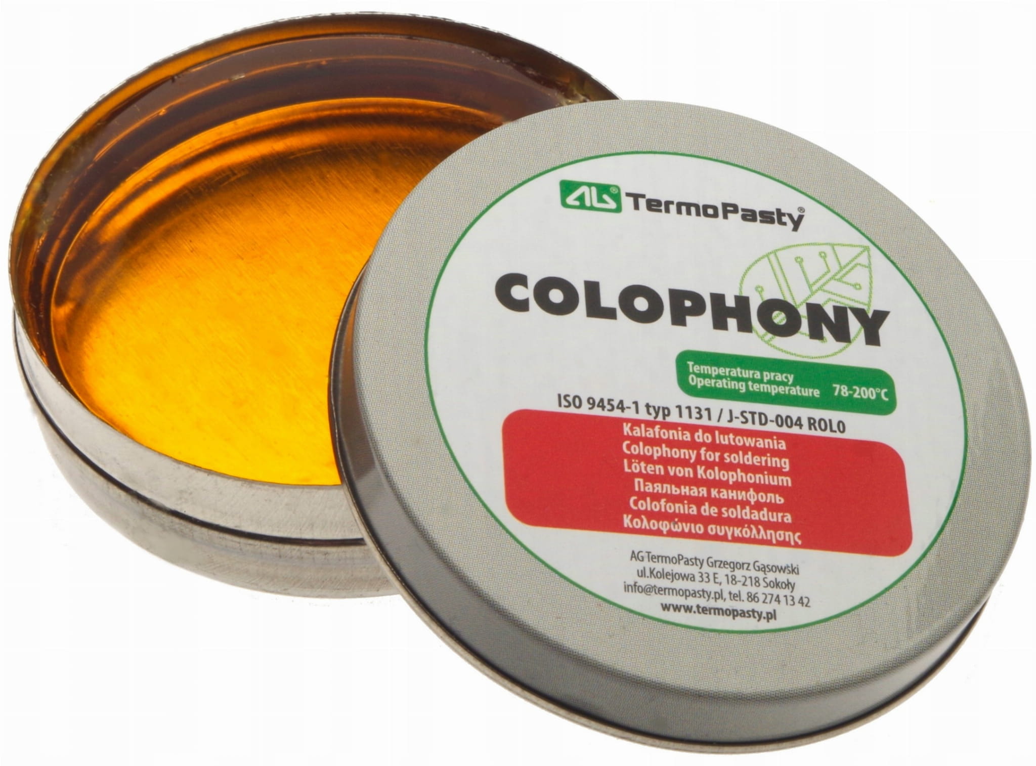 Kalafonia aktywna z dodatkiem aktywatorów ułatwiających lutowanie. Produkt posiada aktywność zbliżoną do pasty lutowniczej. Kalafonia wspomaga proces lutowania, zapobiega utlenianiu się złączy, eliminuje powstawanie zimnych lutów.