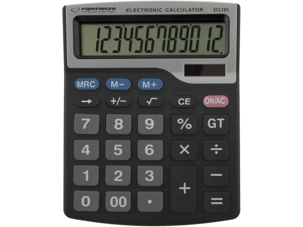 Elektroniczny kalkulator biurkowy z dużym, 12 cyfrowym wyświetlaczem. Posiada wszystkie podstawowe funkcje matematyczne (dodawanie, odejmowanie, mnożenie, dzielenie, pierwiastkowanie, obliczanie procentów), funkcję cofania wpisywanych cyfr oraz możliwość zapamiętywania wyników. Pochylony wyświetlacz, duże wyświetlane cyfry oraz duże klawisze ułatwiają pracę z kalkulatorem. Idealny do codziennego użytku w sklepach i biurach.