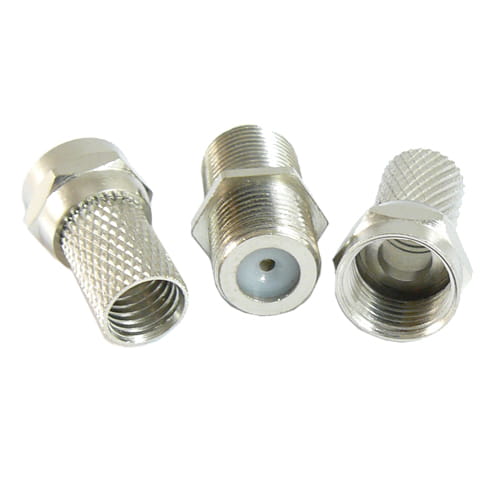 Łącznik dwa wtyki F na gniazdo F podwójne. Złącze F to współosiowe złącze wykorzystywane do łączenia kabli koncentrycznych o impedancji 75 Ohm w instalacjach telewizji kablowych, modemach kablowych oraz telewizji satelitarnej.