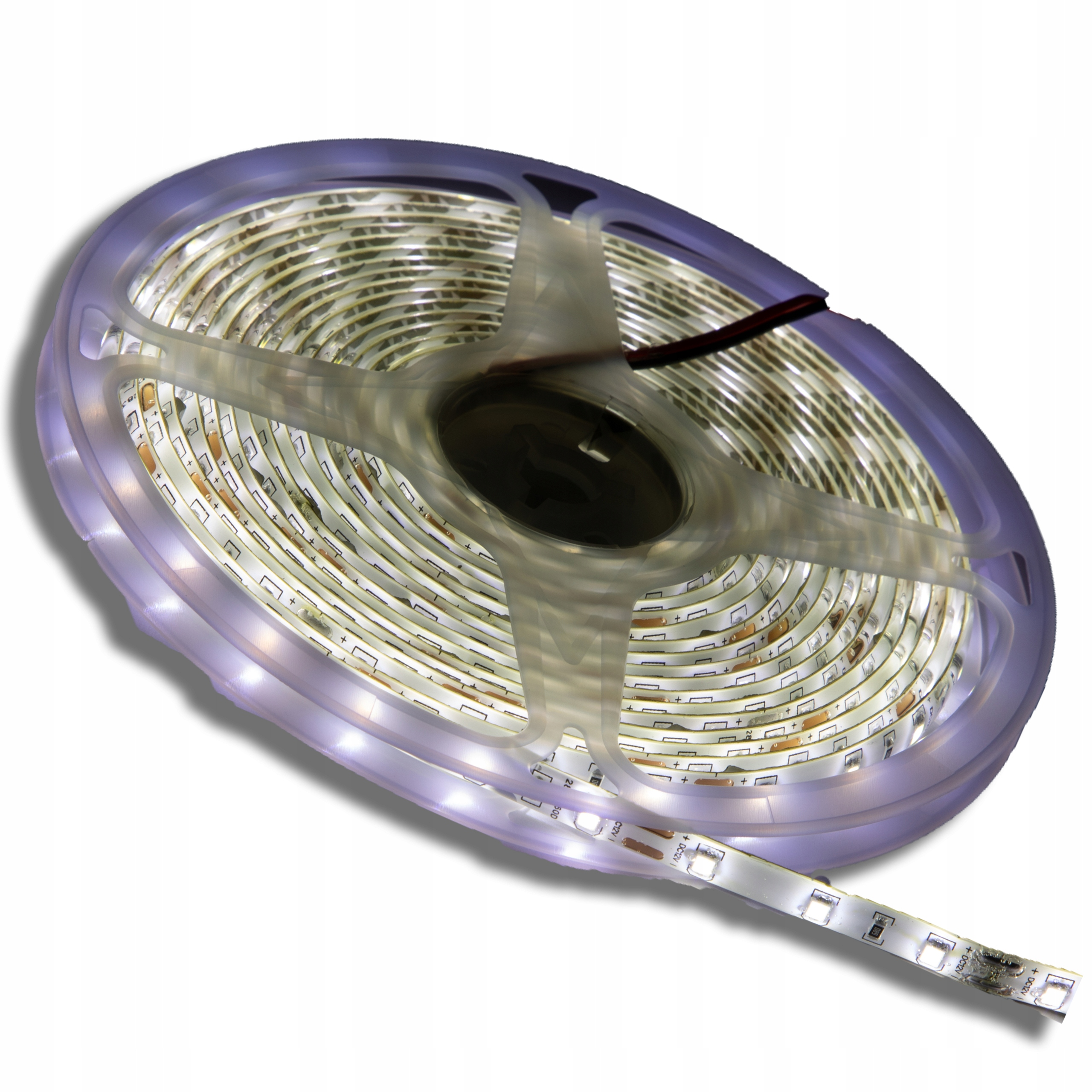 Taśma LED kolor biały zimny. Produkt wykonany został na elastycznej i wytrzymałej taśmie o podłożu PCB. Źródłem światła są diody LED SMD które emitują mocne światło.