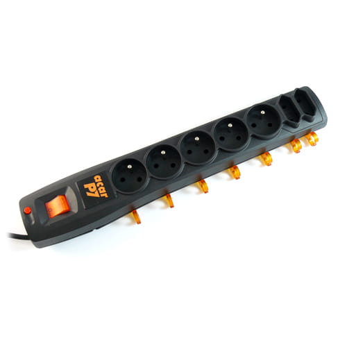 Acar P7 to model dysponujący 7 gniazdami , w tym 5 z uziemieniem i 2 gniazda płaskie. Dodatkowo jest wyposażony w system porządkowania przewodów pozwalający na wygodną i estetyczną organizację przewodów zasilających , biegnących z urządzenia do odbiorników. Dzięki niemu unikniemy plątaniny kabli pod biurkiem, jednocześnie zabezpieczając przed przepięciem 7 urządzeń acar P7 jest wyposażony w automatyczny bezpiecznik , gwarantując prostotę i skuteczność działania.