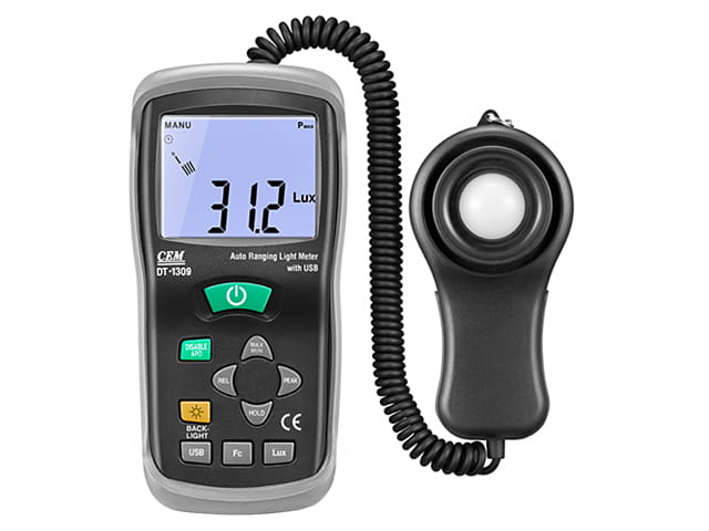 Luksomierz DT-1309 firmy CEM służy do precyzyjnego pomiaru natężenia oświetlenia. Wyposażony jest w głowicę fotometryczną połączoną z miernikiem 1,5 metrowym przewodem. Posiada funkcję automatycznego odcięcia zasilania po 15 min. bezczynności oraz sygnalizację rozładowania baterii.