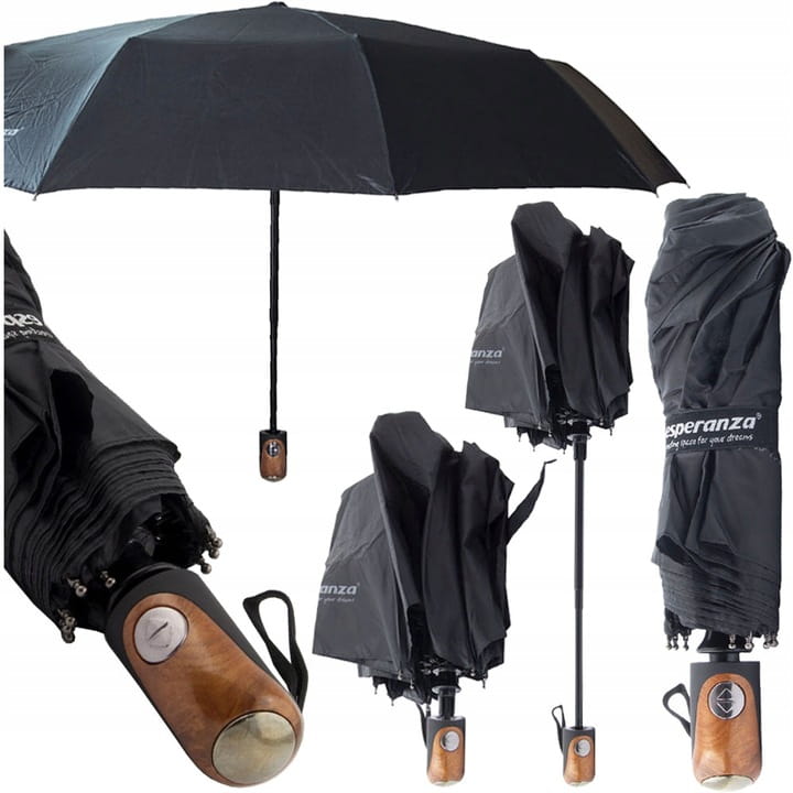 Kompaktowy, bardzo wygodny parasol składany z automatycznym mechanizmem otwierająco-zamykającym - PEŁEN AUTOMAT. Czaszę parasola zrobiono z wodoodpornego poliestru. Trzon parasola z barwionego na czarno metalu. 10-cio ramienna konstrukcja wykonana z metalu oraz włókna szklanego - bardzo wysoka odporność na silne podmuchy wiatru. Rękojeść parasola zrobiono z wysokiej jakości tworzywa sztucznego w atrakcyjnej kolorystyce drewnopodobnej. Spust mechanizmu otwierająco-zamykającego umieszczony został w rękojeści.