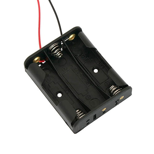 Pojemnik do umieszczenia trzech baterii typu R6 (AA, Mignon) z wyprowadzonymi przewodami montażowymi.