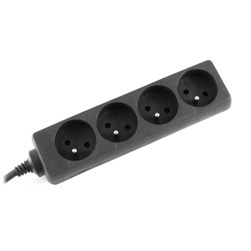 Czarny przedłużacz 4 gniazdowy z uziemieniem o długości 3 m. Przedłużacz do użytku wyłącznie w pomieszczeniach zamkniętych.