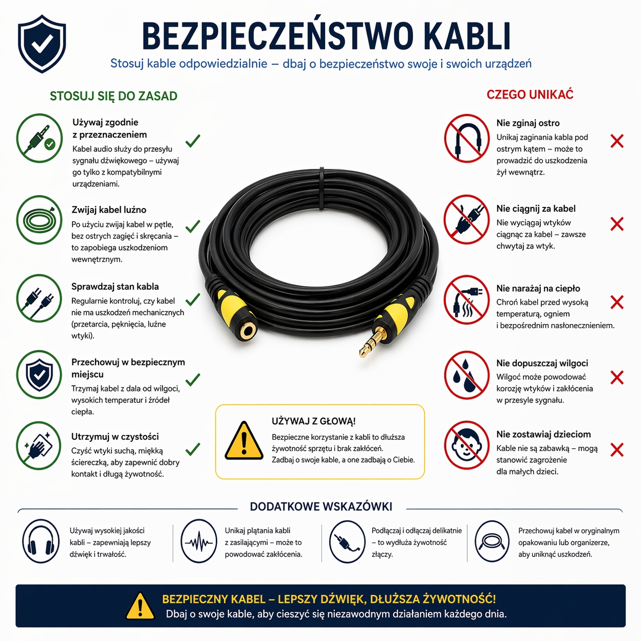 Idealnie sprawdzi się do podłączania słuchawek, głośników, smartfonów, laptopów, komputerów, tabletów oraz systemów audio. Dzięki solidnemu wykonaniu przewód gwarantuje stabilny przesył dźwięku bez zakłóceń i strat jakości.
