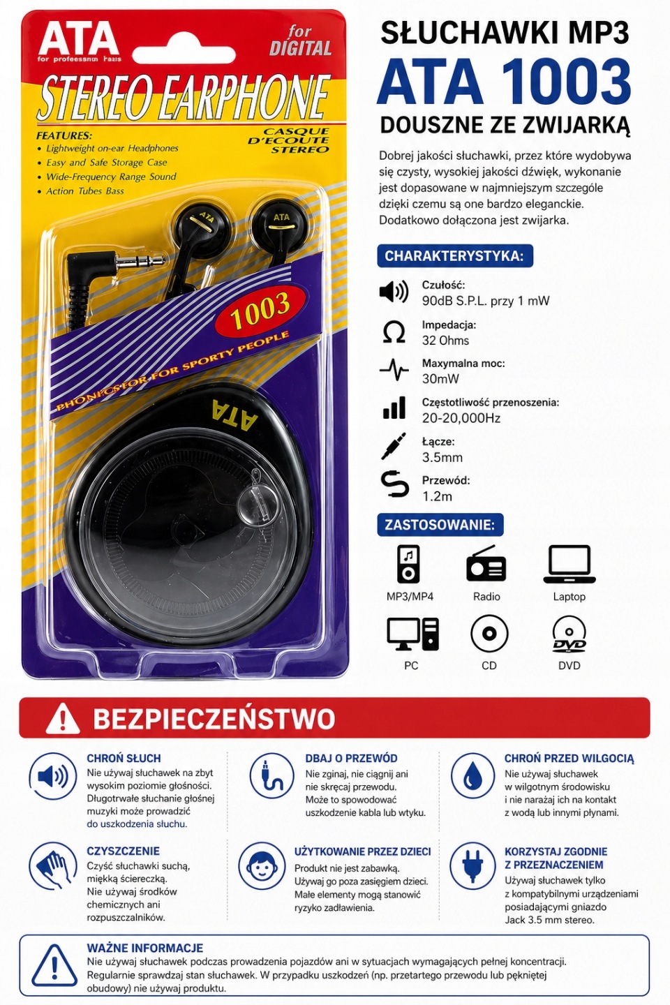 Słuchawki douszne ATA 1003 to praktyczne i wygodne rozwiązanie dla osób, które cenią sobie czysty dźwięk oraz mobilność. Dzięki wbudowanej zwijarce kabla możesz łatwo utrzymać porządek i zapomnieć o splątanych przewodach.