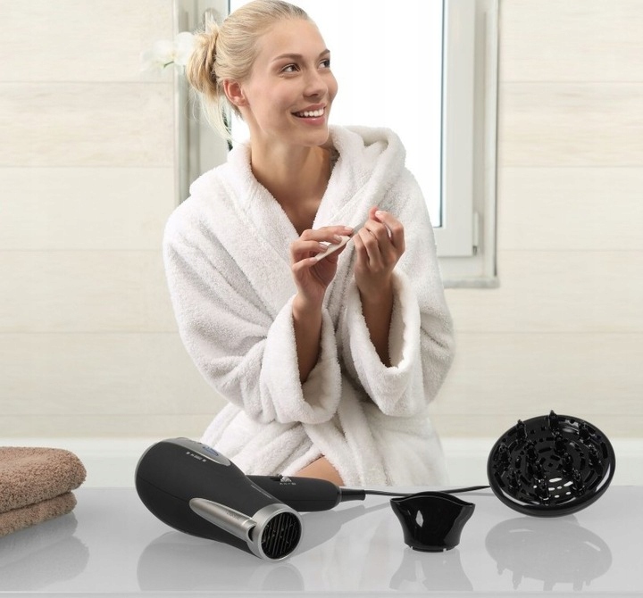 Dodatkowo suszarka ma składaną rączkę i wyróżnia się nowoczesnym wyglądem, piękne matowe wykończenie.