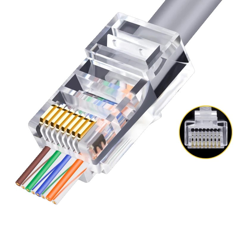 Wtyk modularny z przelotem na poszczególne żyły skrętki. Zapewnia szybsze i sprawniejsze zarobienie złącza.