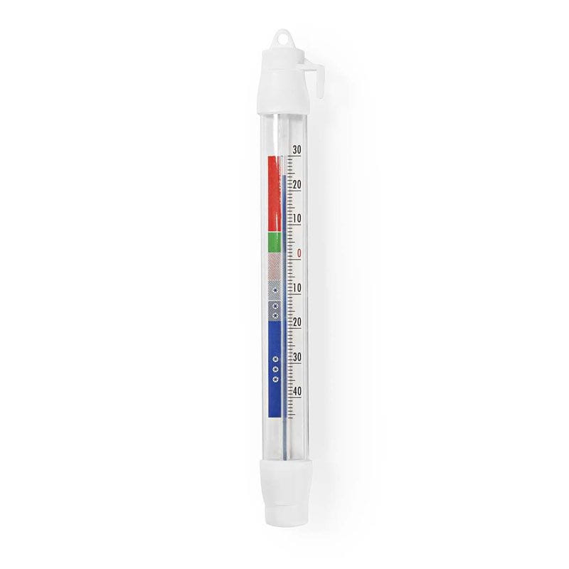 Termometr cieczowy do lodówki i zamrażalnika. Zakres temperatur: od -46oC do +30oC. Uchwyt i oczko do zawieszenia. Materiał: plastik. Opakowanie: blister.