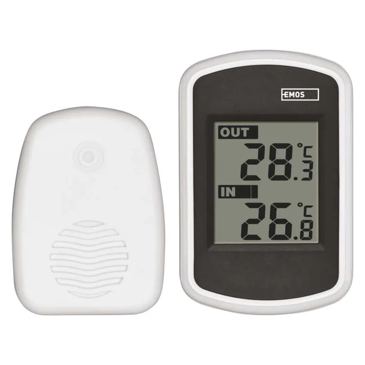Termometr bezprzewodowy z wyświetlaniem temperatury wewnętrznej i zewnętrznej. Termometr ma czujnik bezprzewodowy o zasięgu do 100 m.