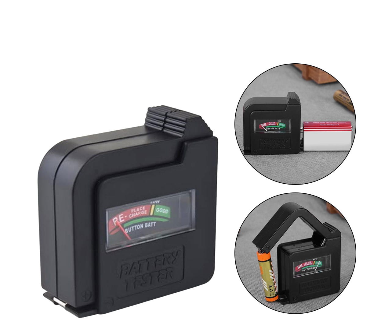 - Służy do testowania następujących rozmiarów: baterie 9V/ogniwa guzikowe 1.5V/zwykłe baterie 1.5V lub akumulatory, takie jak AA, AAA, C, D
