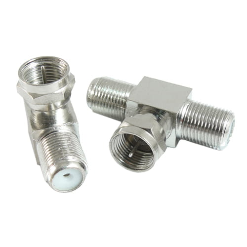 Trójnik - wtyk F na dwa gniazda F. Złącze F to współosiowe złącze wykorzystywane do łączenia kabli koncentrycznych o impedancji 75 Ohm w instalacjach telewizji kablowych, modemach kablowych oraz telewizji satelitarnej.