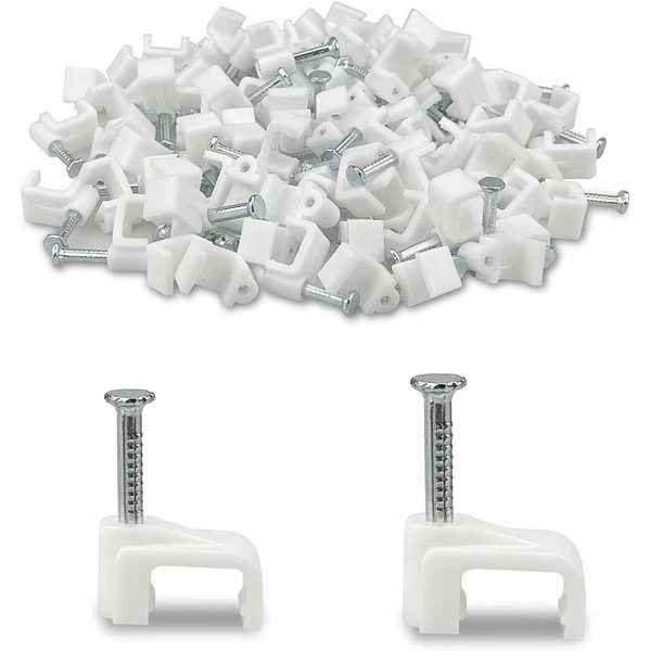 Praktyczne uchwyty do kabli 6 mm płaskie z gwoździem montażowym. Idealne do mocowania przewodów elektrycznych, antenowych i teleinformatycznych do ścian oraz listew.