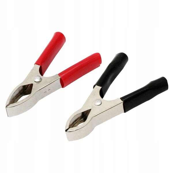 Zestaw dwóch sztuk profesjonalnych złącz typu krokodylki o maksymalnym obciążeniu prądowym wynoszącym 30 A.